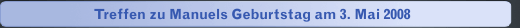 | Am 21.06.2008 wurden 14 Personen plus Gepäck in 3 Autos gestapelt und dann ging es ab nach Runkel an der Lahn. Sebi konnte leider nicht mitkommen, da er mit Slicks ein Regenrennen fahren mußte und gegen die Leitplanke knapp verloren hatte. Dafür waren Yvonne und Roland mit von der Partie. |