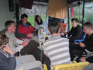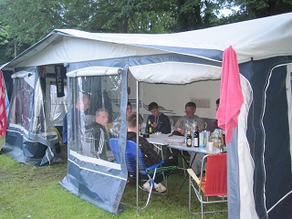 | Ein angemieteter Wohnwagen mit großem Vorzelt diente als regengeschützter Versammlungsraum. |
